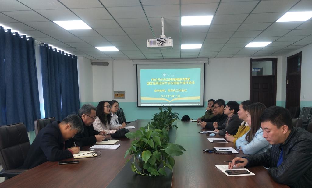 2021年3月11日,在suncitygroup太阳新城三楼会议室召开了呼伦贝尔市三科统编教材教师国家通用语言文字应用能力提升培训指导教师和督导员工作会议。
